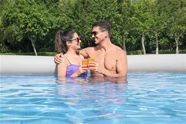 - Vælg et vandret og jævnt underlag, pust topringen op, og poolen hæver sig i takt med, at den fyldes med vand