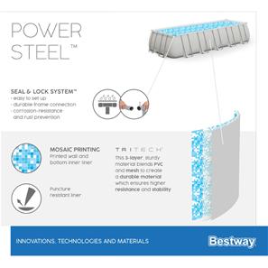 The Bestway® Power Steel™ Above Ground Pool er let at sætte op, og er bygget til at holde. Dens holdbare, korrosionsfaste stålramme er udrustet med vores Seal & Lock System™ for en robust og sikker konstruktion. Tritech™ foringen er lavet af holdbart material der er forstærket for styrke og punkteringsmodstand.