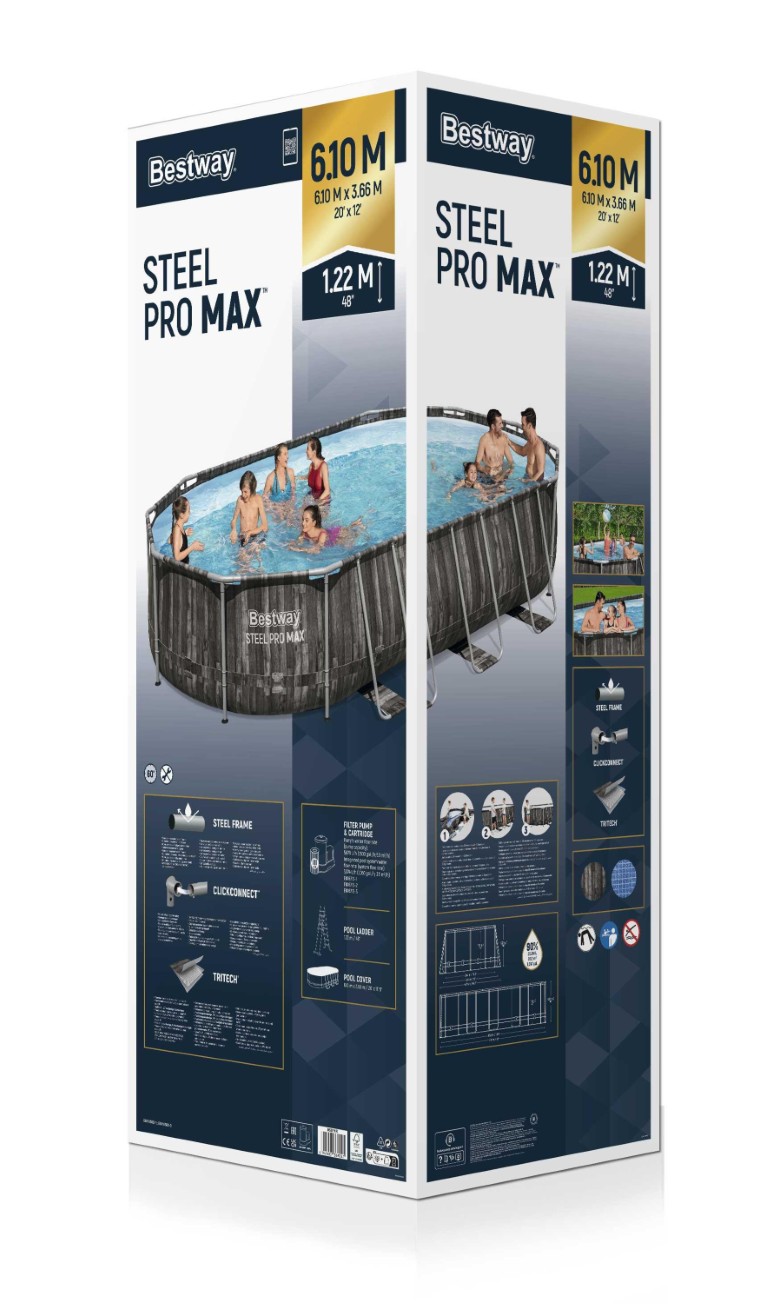 Sommerens vandpjasken er en leg med Bestway® Steel Pro MAX™ Poolen! Den holdbare stålramme er udstyret med ClickConnect™-samlinger, der sikrer en robust og sikker rørforbindelse. Rammeforbindelserne kan nemt og hurtigt samles, og de forhindrer også kontakt mellem metal og metal, undgår korrosion og sikrer rustbestandighed. Den robuste Tritech®-dug er lavet af et 3-lags materiale, der er forstærket for styrke og punkteringsmodstand. Tritech er 15% mere rivefast, 33% mere strækfast og 83% mere punkteringsfast end standard-PVC, hvilket sikrer, at din pool holder sommer efter sommer. Denne attraktive pool er meget nem at sætte op og tage ned til opbevaring uden for sæsonen. Der kræves intet værktøj, og en slange kobles til den indbyggede flowkontrolventil for hurtigt og nemt at dræne poolvandet væk. Dette poolsæt leveres også med en filterpumpe, der hjælper med at holde vandet rent!