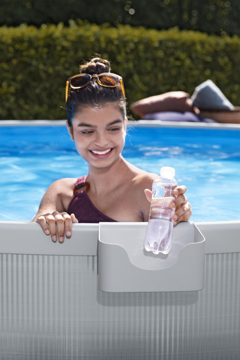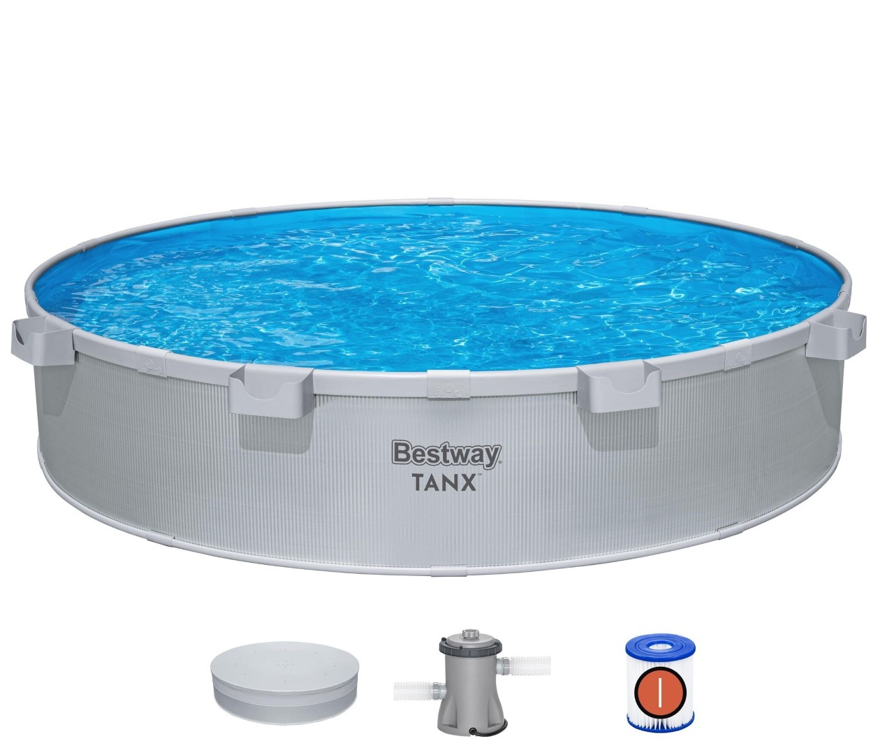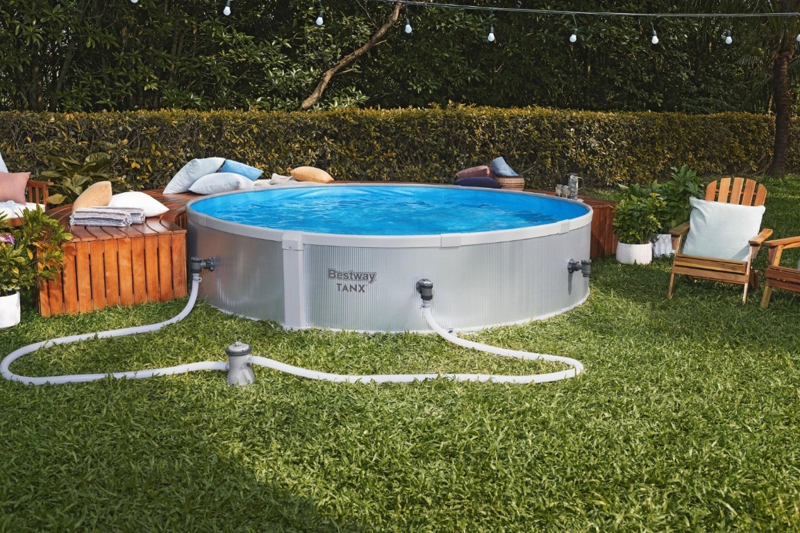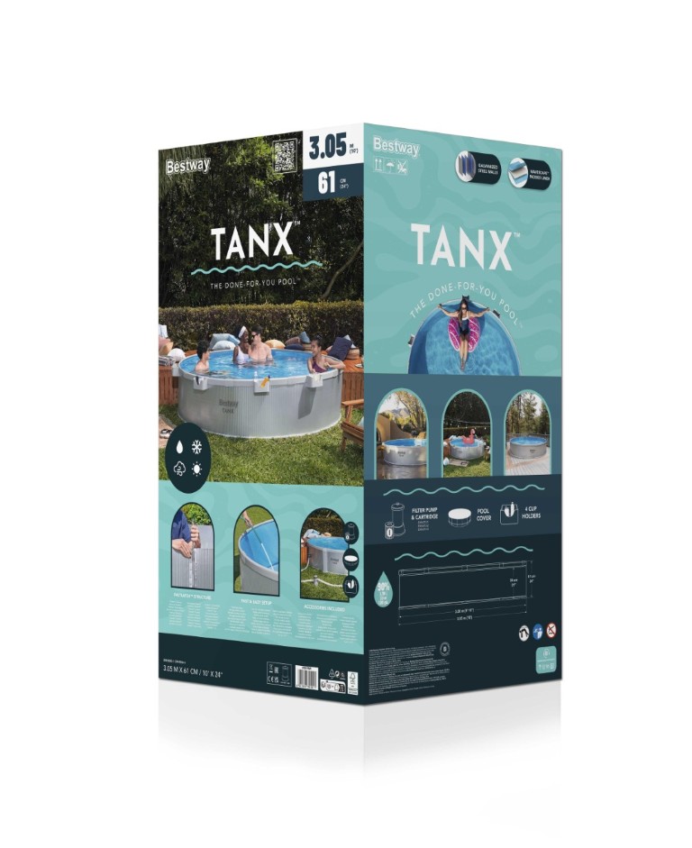 Bestway® TANX™ Pool-sæt forvandler din gør-det-selv-pool til en DFY-pool – Done For You! Skab din egen oase i baghaven med alt, hvad du behøver, i én kasse: en færdigskåret pool, en filterpumpe, et pooldækken og fire flytbare kopholdere. Væggene er fremstillet af 100 % galvaniseret stål, som derefter er belagt med et lag zink for at forhindre rust og skader fra miljøet. Indvendigt har Wavescape™-dugen en UV-bestandig belægning, der forhindrer misfarvning eller revnedannelse i solen. Dugen har også fået ekstra forbedringer, herunder polstring for behagelig afslapning og Polar-Shield™-beskyttelse, så du kan lade den stå ude hele året rundt, selv i koldere temperaturer. Den innovative FastLatch™-konstruktion fastgør nemt de to ender af væggen til hinanden og sikres med en robust stang, så den er klar til brug på 25 minutter (med 2-3 personer)!