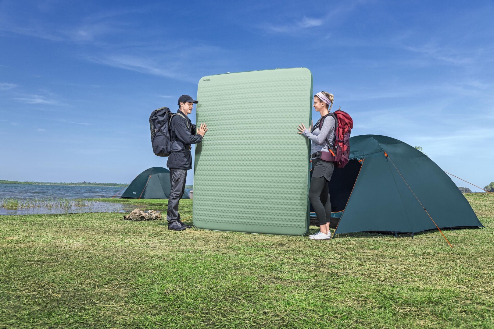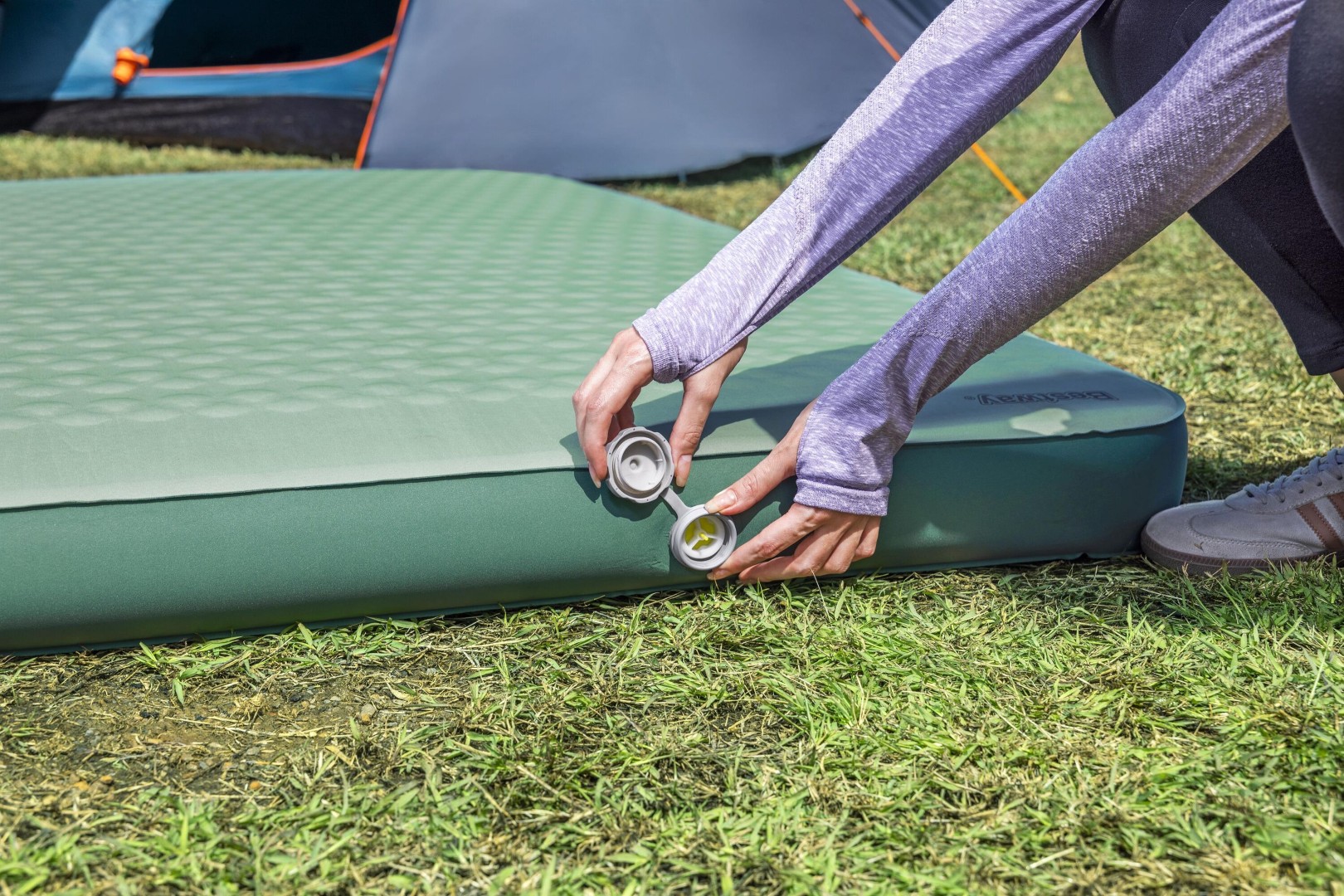 - Skumunderlaget puster sig selv op, når ventilen åbnes, og udvider sig til 11 cm tykkelse for ekstra komfort og støtte.