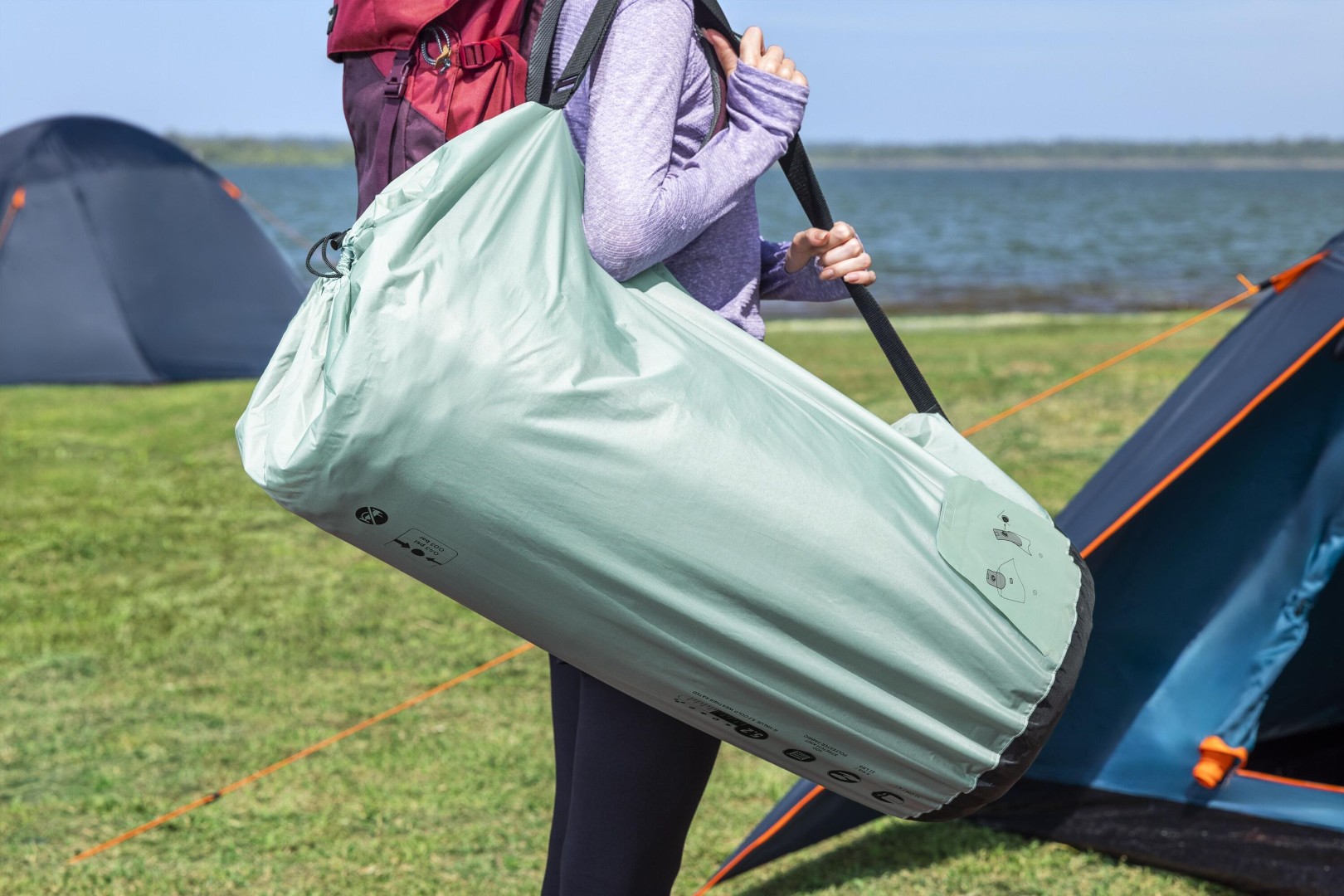 - Den medfølgende sæk kan bruges som pumpesæk til at puste underlaget op.