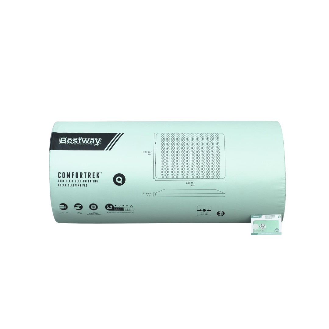 Giv dig selv en behagelig nats søvn, selv når du er på eventyr i vildmarken, med Bestway® ComforTrek™ Luxe Elite Selvoppustelig Queen Liggeunderlag. Med sit selvoppustelige design og den bløde skumkerne holder du dig varm om natten, mens du nyder ekstra polstring og støtte med denne liggeunderlag. Med en R-værdi på 5,2 er sovepuden ideel til koldt vejr og har et unikt NuuFlex™ indvendigt skumdesign, der giver en lettere, mere åndbar og meget komprimerbar struktur for komfort og kompakthed. Det nye skum reducerer liggeunderlagets vægt og er omgivet af et patenteret, punkteringsbestandigt og PVC-frit ToughLite™ TPU-materiale med en blød, men fleksibel 50D stretch-strikket polyesteroverflade, der gør den både behagelig og varm, så du kan få en god nats søvn, selv når du camperer! Det selvoppustende design gør opsætningen nemmere. Du skal blot dreje de eksklusive SpinSeal 360™-ventiler, så oppustes liggeunderlaget automatisk og udvider sig til en tykkelse på 11 cm. Du kan også bruge opbevaringsposen som en pumpepose til at pumpe liggeunderlaget hurtigere op eller skabe en fastere soveflade. Hold dig varm og komfortabel, mens du nyder eventyret med ComforTrek Luxe Elite Selvoppustelig Queen Liggeunderlaget.