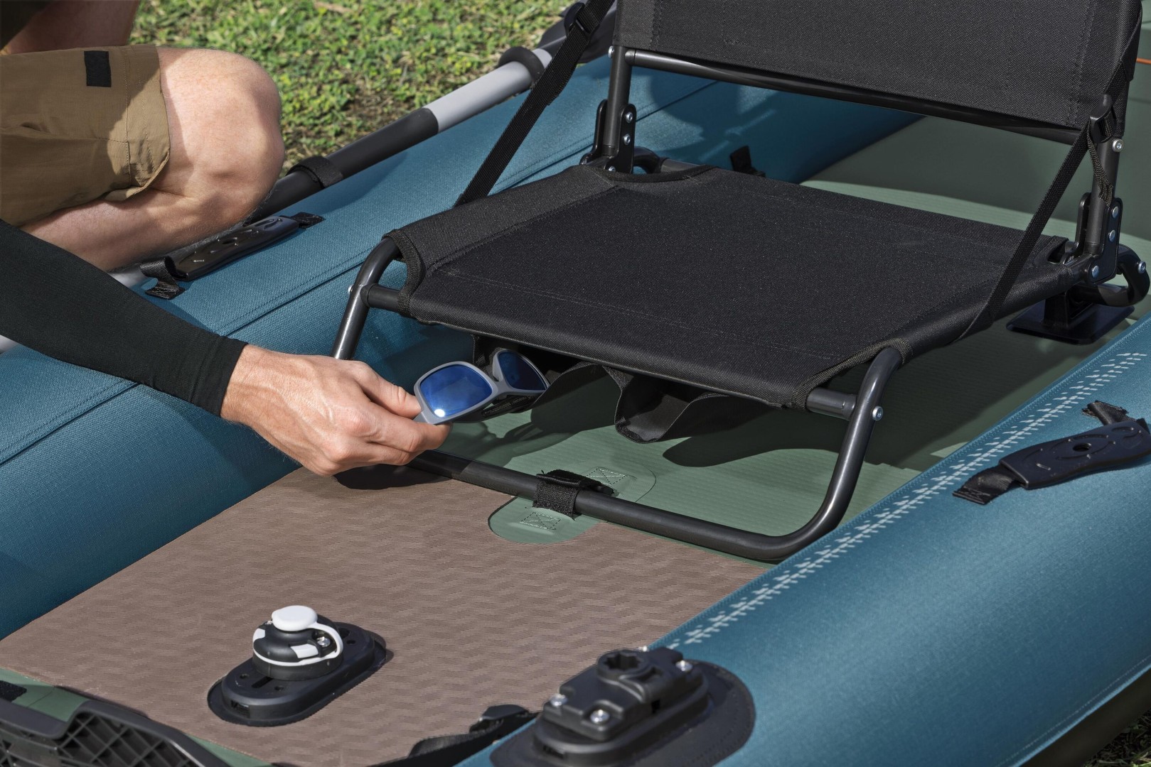 - 1 aftageligt sæde i galvaniseret stål til brug i kajakken eller på bredden med opbevaringsrum under og en lynlåslomme bagved