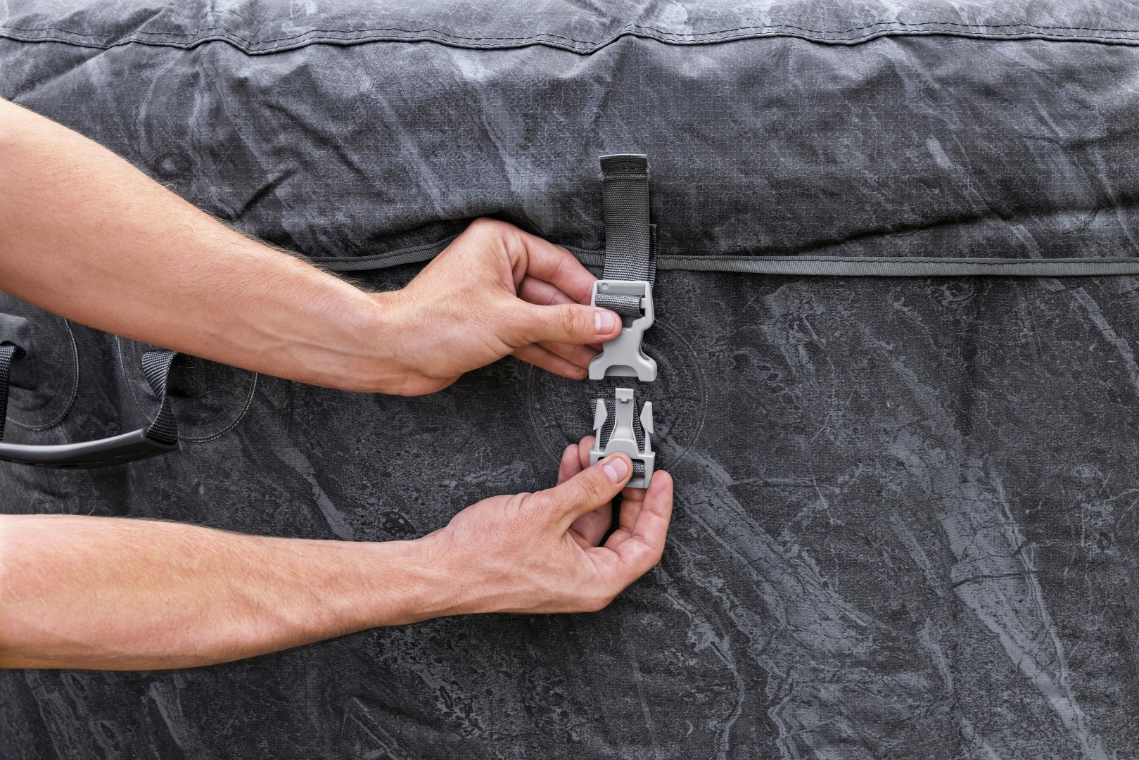 Dette spabad-sæt har en multifunktionspumpe, der styrer oppustnings-, opvarmnings- og filtreringssystemerne, en ChemConnect®-dispenser, der opretholder det rette kemiske niveau, og et forstærket dækken, der holder varmen inde og snavs ude.