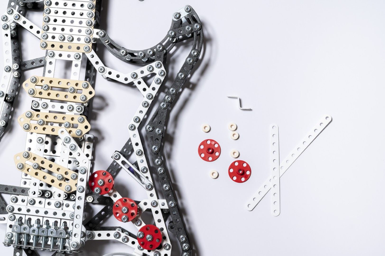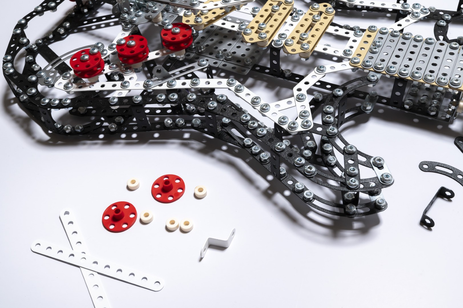 Unik dekoration – et håndlavet stykke til selvmontering – en model i skala 1:1. Sættet indeholder metalplader, skruer og møtrikker samt monteringsværktøj. Den elegante æske indeholder også detaljerede, trykte trin-for-trin-instruktioner. Skabelsesprocessen er spændende, endda hypnotisk (anslået byggetid: 20+ timer), og det endelige resultat er fascinerende – en autentisk udseende guitar, lidt over 100 cm høj, med bevægelige dele (taster, knapper, kontakter osv.). Modellerne fås i forskellige farver.