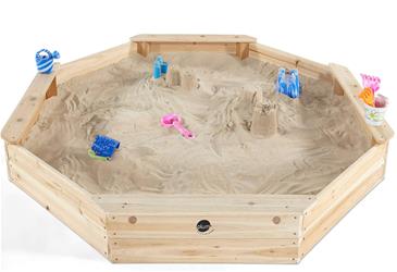 Plum® Giant Ottekantet Træ Sandkasse er lavet af premium FSC®-certificeret træ med afrundede hjørner for øget sikkerhed. Let at samle og leveres med et beskyttende dække og jord ark. Det interne bunddække forhindrer ukrudt i at vokse op igennem bunden og vand kan løbe ud af din sandkasse.