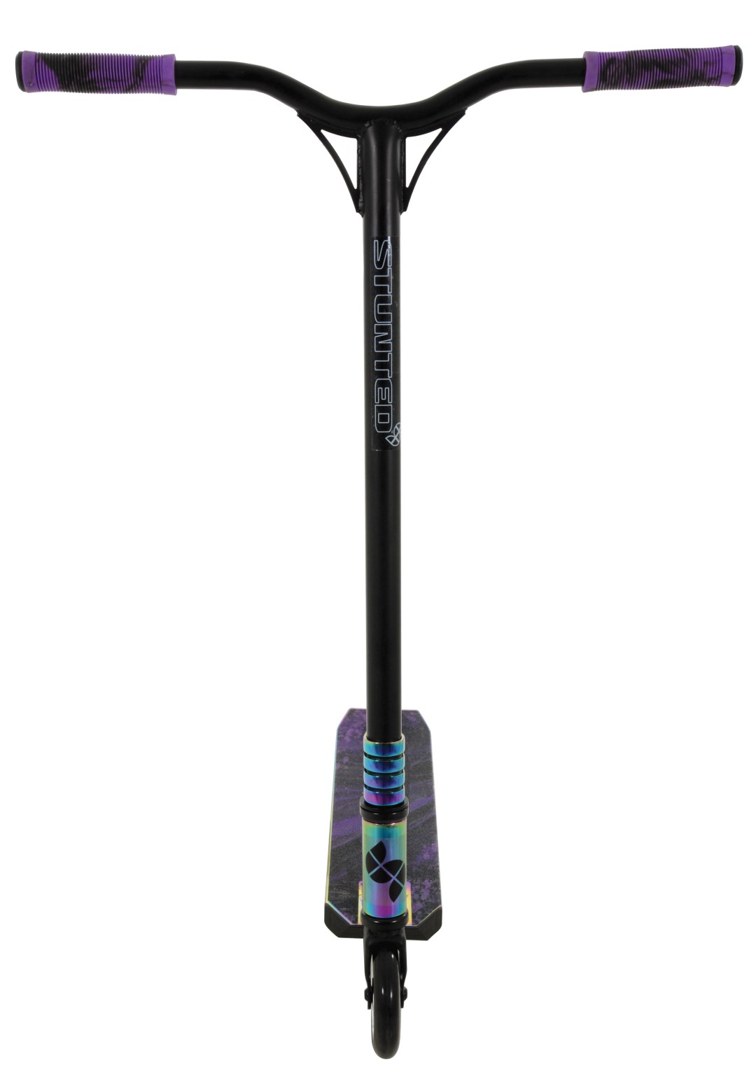 Styrets og frempindens forstærkede aluminiums-V-stil design i ét stykke sammen med den pro-grade quad-klemme sikrer en solid styrebase med trykte, støbte greb for komfort. 6063 aluminium, neochrome box-dækket tilbyder fremragende stabilitet, da det er let og derfor fantastisk til at perfektionere tricks som piske. Boksdækket giver også reduceret risiko for skader på anklerne