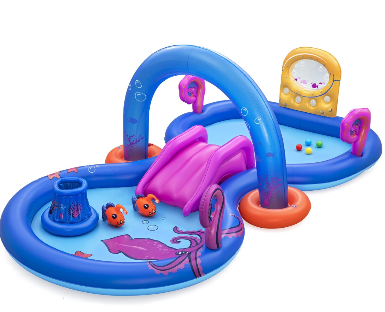 - Indhold: 1 pool, 1 rutsjebane, 1 buesprinkler, 1 kurv, 2 Puffy Pal™-fisk, 2 ketsjere, 4 legebolde, reparationslap