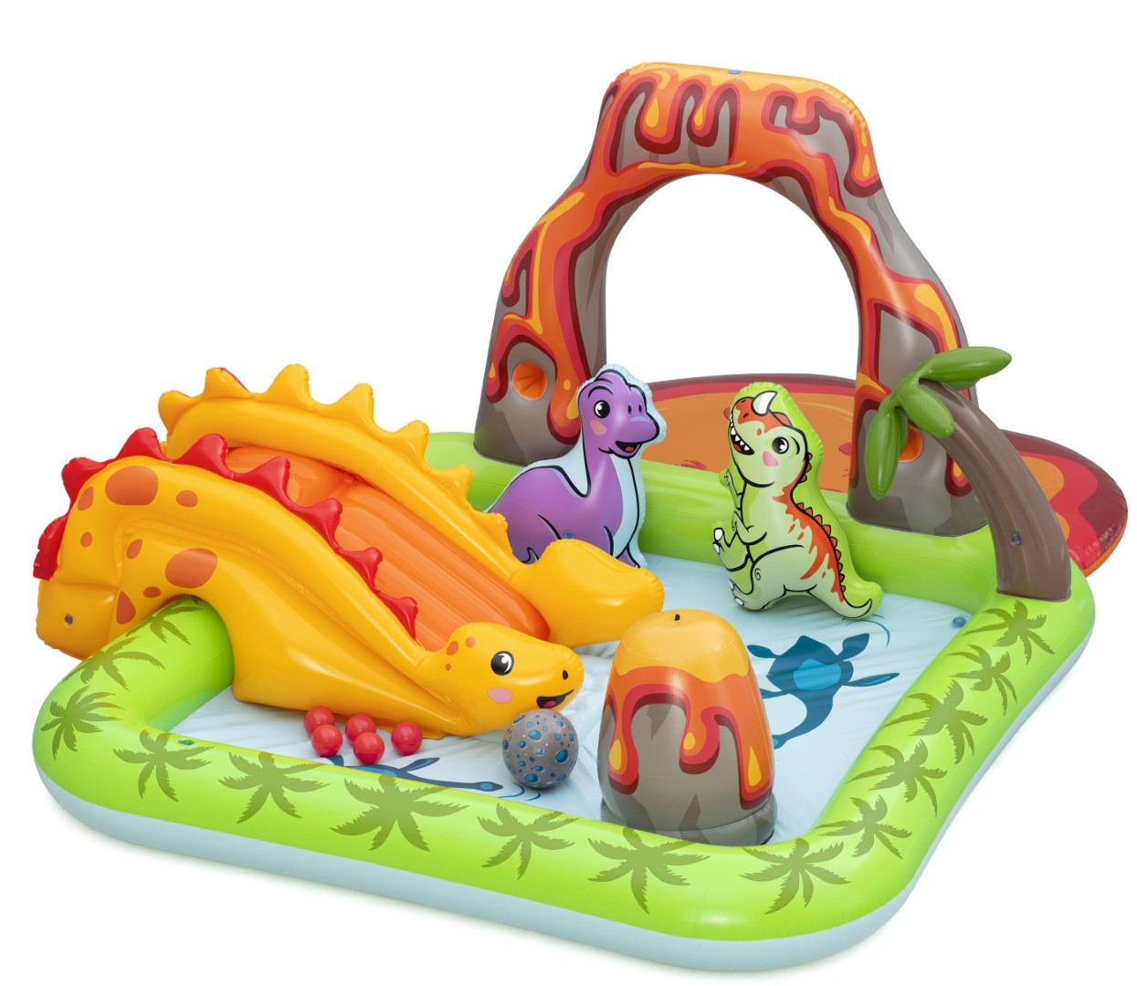 Gå på opdagelse i forhistoriske lande, og kast dig ud i dino-mite-sjov med Bestway® Volcano Springs™ Legecenteret! Legecentret er skabt til børn fra 2 år og opefter og har en minivulkan-vandsprøjte, der skyder vand op i himlen. Børnene kan styrke deres finmotorik ved at skiftes til at sætte de medfølgende legebolde på vandstrålen, så de svæver over lavaen. Desuden omfatter legecentret en aftagelig vandfyldt, blød blobz, der kan bruges til at lege eller ligge på uden for poolen; en vulkanbue med en sprinkler, der nemt kan tilsluttes en haveslange og har huller til at sortere bolde, og ekstra oppustelig polstring på poolbunden i bunden af rutsjebanen for at give de små ekstra komfort. De vil elske at blive afkølet og slappe af med deres 2 Puffy Pal™ dinosaurer og asteroide badebold, omgivet af et oppusteligt palmetræ på ydersiden af poolen. Når du er færdig med legecentret for i dag, kan du lukke poolvandet ud med den brugervenlige aftapningsventil og folde det sammen til senere brug. Med plads nok til venner har det aldrig været sjovere at plaske i solen end med Bestway Volcano Springs Legecenteret!