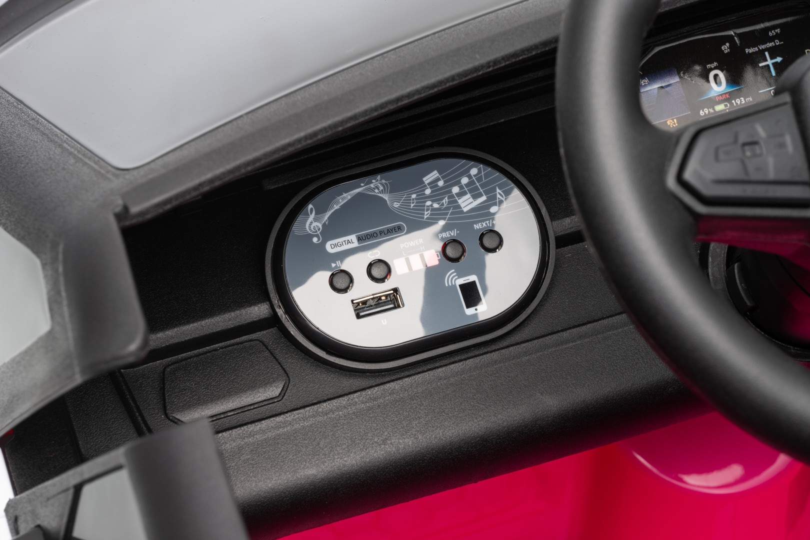 Bilen er udstyret med USB- og AUX-indgang, så dit barn kan høre sine yndlingssange under køreturen. Derudover sørger de indbyggede højttalere og musikfunktion for masser af sjov på farten.
